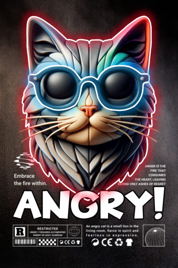 arg katt, neonilska, emotionell kraft, stilren vrede, eld inuti, mjuk yta hårt hjärta, ilskekonst, kattikon, rebell-päls, visuell vrede