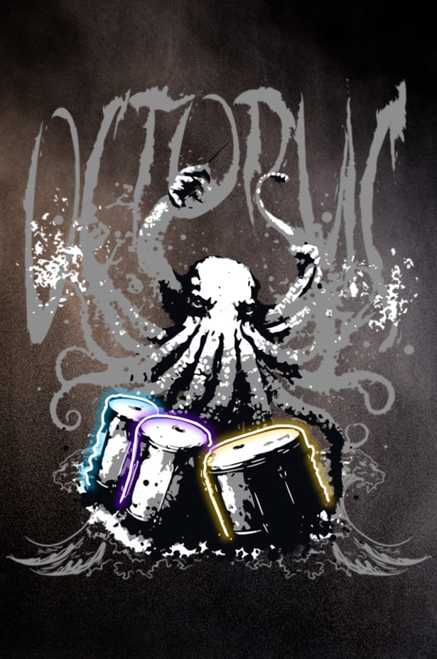 neon djuphavstrummis, bläckfiskens rytmgud, kraken trumritual, glödande undervattensrytm, avgrundens beatsmonster, oceanisk trummisdesign, tentakeltrumhärskare, mytisk havsrytm, bläckmusik bläckfisk, mörkt hav neontrummis.