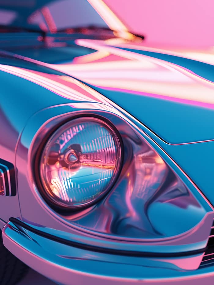 En spegelblank blå kaross med reflektioner av rosa, lila och neonljus. Strålkastaren – en lysande ring av grönt och vitt – skär genom paletten som ett cybernetiskt öga. Varje kurva fångar ljuset och kastar tillbaka det som flytande metall.