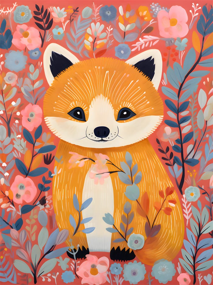 räv barnposter, blomsterillustration djur, färgglad räv tavla, söt djurillustration barn, skandinavisk barnkonst, sagodjur väggkonst, naturtema barnrum, räv illustration väggkonst, inspirerande barnmotiv, lekfull djurkonst