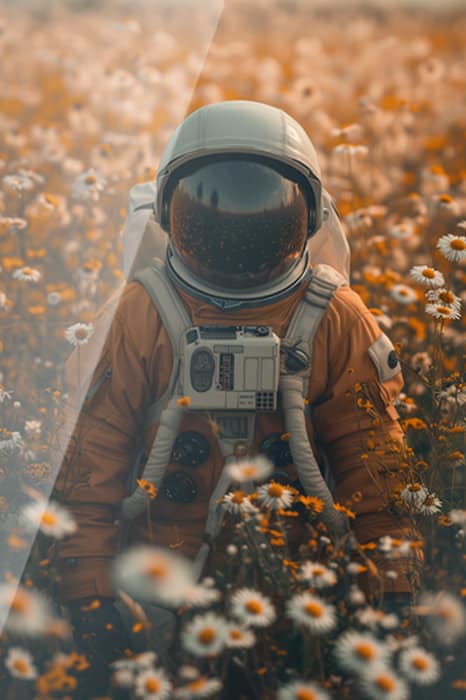 En fascinerande illustration av en astronaut som sitter i ett hav av prästkragar, där den oändliga rymden möter jordens skönhet. En perfekt balans mellan teknologi och natur.