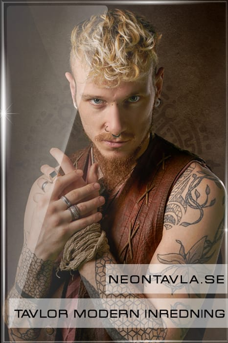 Blond man med tatueringar på båda armarna, ringar på båda händernas fingrar, stirrar rakt in i kameran.