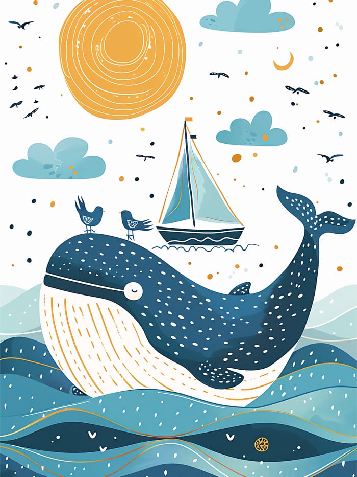 Den stora, blå kroppen vilar i svallande vågor. Vita prickar glittrar som stjärnor över huden, och den ljusa magen bär mjuka linjer. Två små fåglar balanserar glatt på dess rygg, medan ett segel i bakgrunden fångar vinden. En lysande gul sol och lekfulla moln ramar in scenen i ett sagolikt ljus.