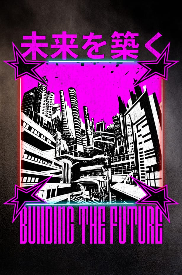 framtidsby, brutal neon, cybervision, betongdröm, japansk framtid, glitchutopi, stjärnrevolt, byggsystem, techno-arkitektur, hopp i höghus