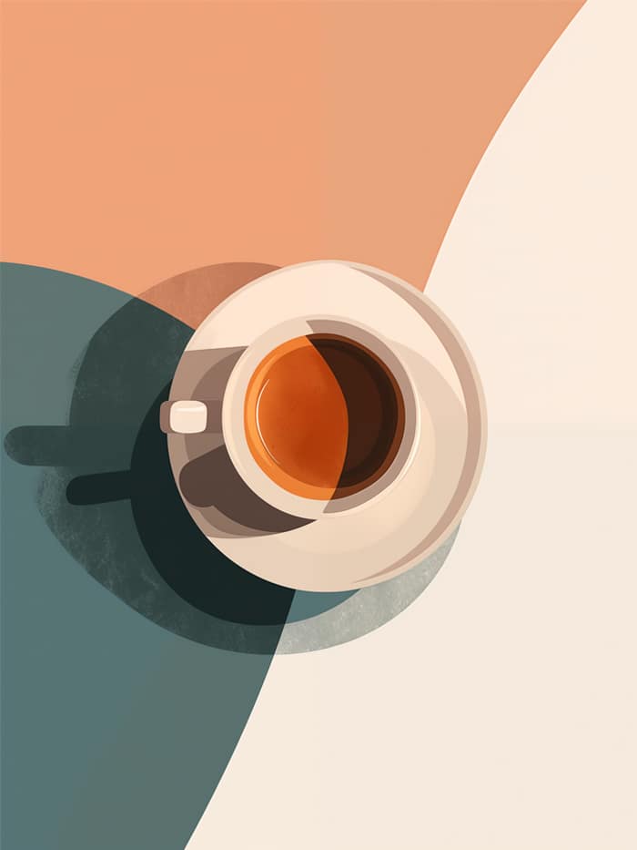 CAFÉLUX fångar ögonblicket av kaffets magi – sett ovanifrån som ett minimalistiskt konstverk. En elegant kopp espresso vilar mitt i bilden, omgiven av mjuka, böljande färgfält i terrakotta, crème och djupgrönt. Ljuset faller exakt över koppen och skapar en varm halo-effekt, som får kaffet att kännas både inbjudande och ikoniskt. Den här bilden är lika mycket morgonritual som modern design – perfekt för kök, kontor eller fikahörnan.
