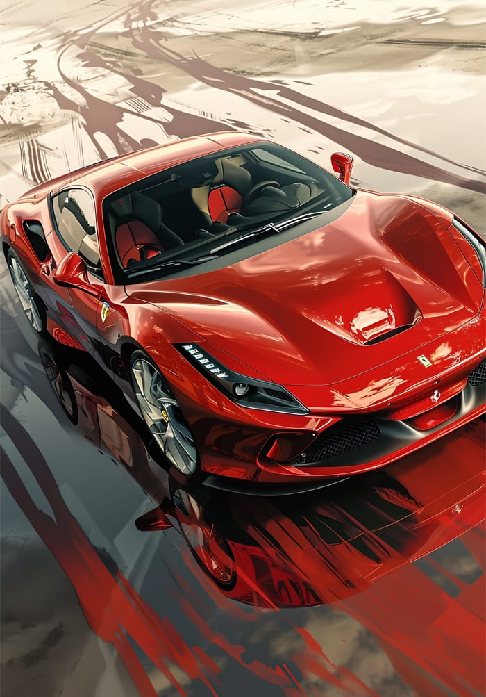 Röda penseldrag av däck och eld färgar marken. Det är inget mönster – det är ett språk. Bilen talar med varje sladd, varje gnista. Och bakom den: bara ekon av fart.
