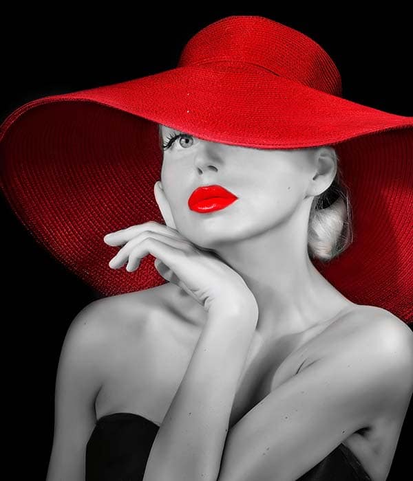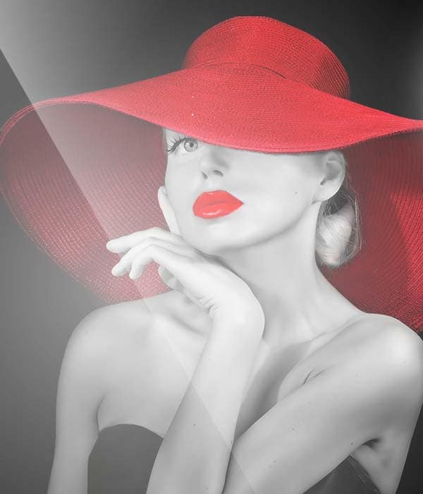 Pretty Lady med en röd hatt i gråa toner, prydd med rosa eller vitt neonljus som ger den en modern och elegant touch, säljs i 2 storlekar om 1000mm x 866mm och 700mm x 615mm