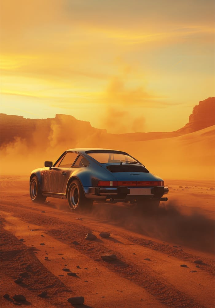 Kopparröd sand mot blå metall. Neongröna däck ritar cirklar i öknens historia. Baklyktornas isblå sken skär genom värmen som en kodsignal från framtiden.