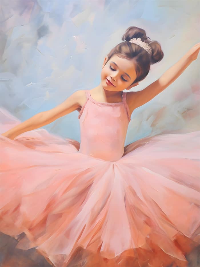 ballerina, balettflicka, pastellrosa, drömsk dans, impressionistisk konst, barndomsgrace, snurrande rörelse, elegant tutu, sagotiara, oljemålningskänsla, mjuk konst