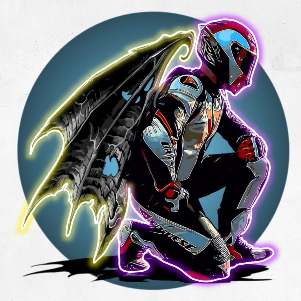 demon rider konst, darkwing motorcykel design, neon hjälte estetik, futuristisk biker ängel, cyborg revenge mode, epoxykonst superhjälte, streetstyle med vingar, outlaw warrior poster, svart ängel grafik, Dainese death squad.
