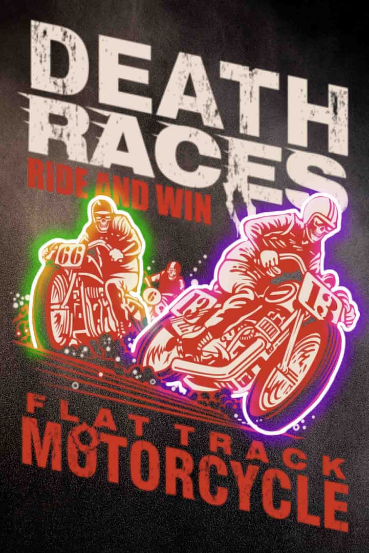 Texten “DEATH RACES” står i stora, slitna bokstäver högst upp, medan “RIDE AND WIN” är skrivet i rött under den. Längst ner finns texten “FLAT TRACK MOTORCYCLE” i en röd, robust stil som förstärker den råa och tävlingsinriktade känslan.