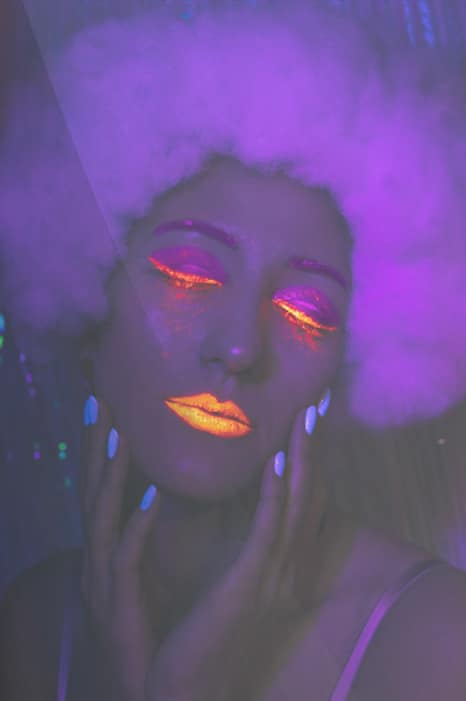 - Sminkdetaljerna runt ögonen och läpparna är markerade med intensiva neonfärger för en hypnotisk look.
