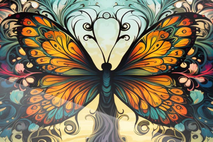Detta konstverk presenterar en praktfull fjäril med utsökta detaljerade vingar i levande orange, blå och gula nyanser. Vingarnas mönster är konstnärligt utformade med böljande former och bladliknande element, vilket ger en känsla av både natur och fantasi. Bakgrunden är fylld med blommor och virvlande mönster, som skapar en drömlik och harmonisk atmosfär.