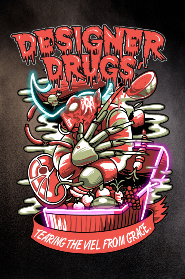 designer drugs konst, syntetisk synd, neon surrealism, giftig gudinna, cyberpsykedelisk design, provocerande tryck, mörk fruktkonst, rave apocalypse, skräck i färg, stiliserad dekadens