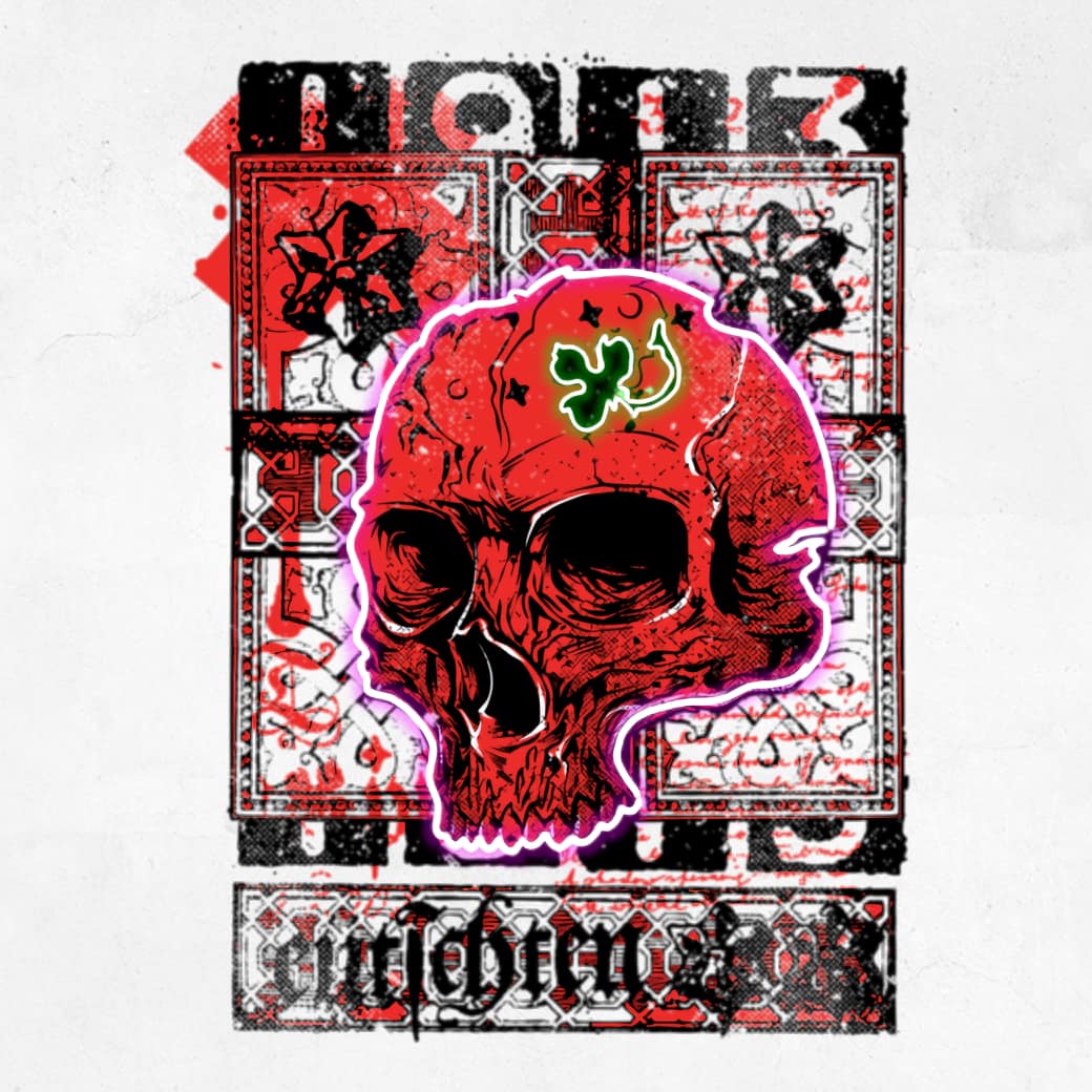 En djärv fusion av medeltida symbolik och modern streetart – denna neonlysande röda dödskalle är lika mycket ett konstverk som ett rop på uppvaknande. Mot en bakgrund av dekadenta mönster och skriftfragment reser sig skallen som en ikon för kaos, kollaps och kreativitet.