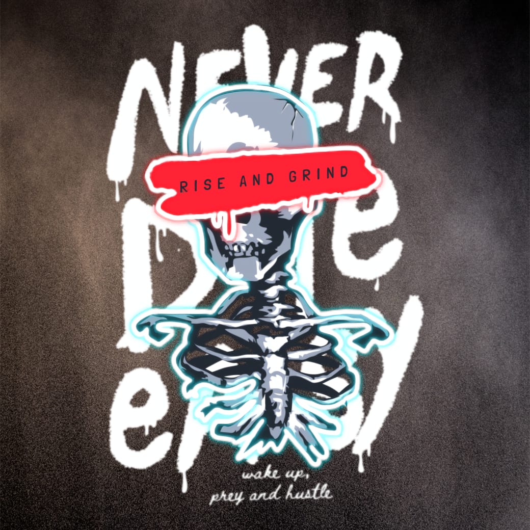 hustle-dödskallekonst, grindcore-design, neon-skelettposter, never die easy-graffiti, urban dödsestetik, rise and grind-vibe, motiverande dödskallekonst, de döda sover inte, streetwear-dödskalle, neon-rebell-skelett