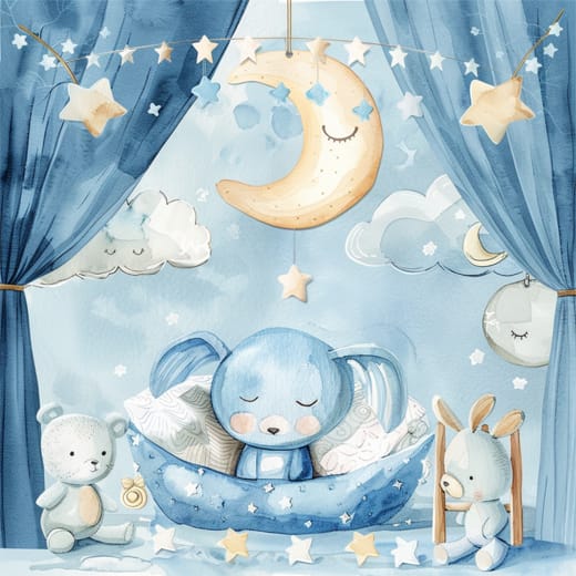 En blå drömvärld där sömnen smyger in med stjärnstoft och godnattsagor. En mjuk kanin vilar under en neonlysande måne, omgiven av sina trogna vänner. Allt inramat av sammetsblå gardiner som vaktar drömmarnas land.
