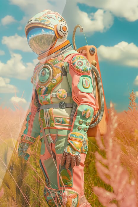 Detta fascinerande konstverk visar en futuristisk astronaut som står mitt i ett fält av mjuka rosa och gyllene växter under en pastellblå himmel fylld med fluffiga moln. Astronautens dräkt är dekorerad med intrikata, färgstarka mönster och texturer som förenar organiska och teknologiska element. De varma, drömlika tonerna i omgivningen kontrasterar vackert mot hjälmens reflekterande visir som speglar den fridfulla himlen. Detta konstverk framkallar en känsla av lugn utforskning, där gränserna mellan natur och teknologi smälter samman i harmoni. Perfekt för att tillföra surrealistisk skönhet och lugn till vilket rum som helst.