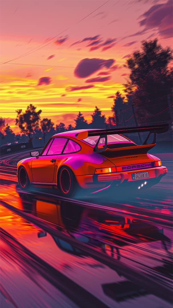 När solen brinner som mest, vaknar legenden. Denna silhuett – en Porsche med neonblod – fångad i rörelse mot en himmel som glöder i purpur och eld. Det är inte bara en bil, det är ett avtryck i tiden.