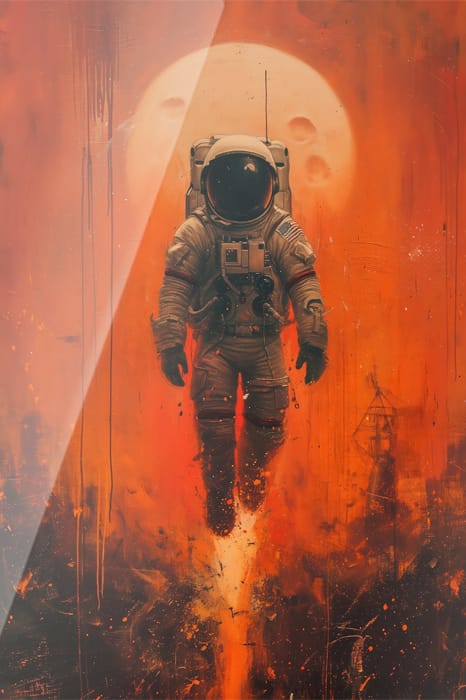 En kraftfull och dynamisk bild av en astronaut som stiger upp genom eld och rök, med en brinnande himmel och en lysande måne i bakgrunden. En fusion av futurism och rå energi.