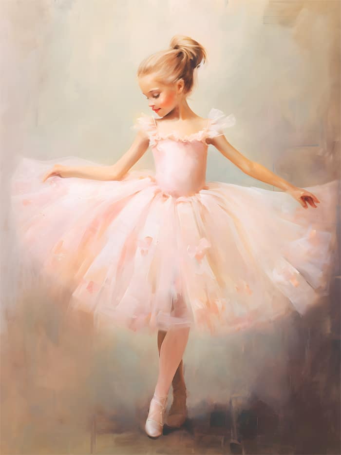 ballettjej, pastellkonst, ballerina, barndom, elegans, impressionistisk stil, rosa tyll, dans, graciös rörelse, oljemålningskänsla, klassisk skönhet