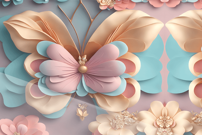 fjäril, vit neon, papperskonst, blomformade vingar, rosa och blå toner, harmonisk design, drömsk estetik, stiliserade blommor, elegant komposition