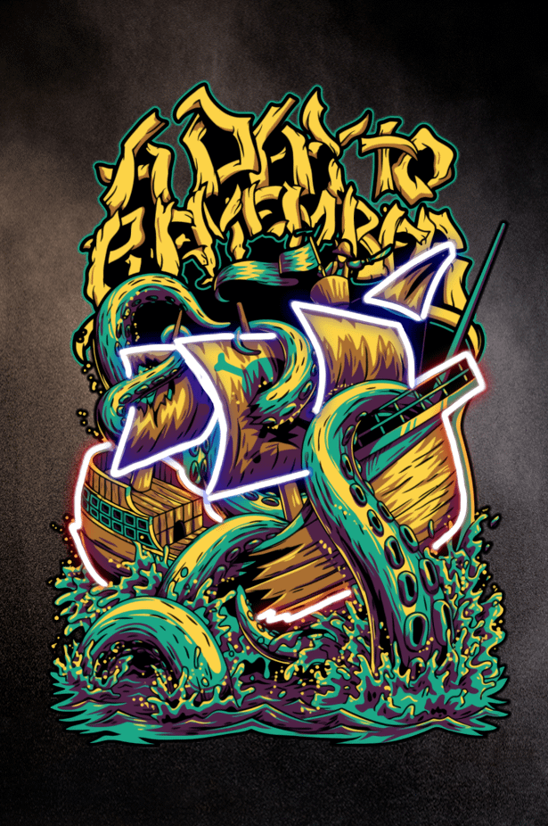 En vrålande bläckfisk – större än myten, vildare än stormen – har siktat in sig på ditt sista andetag. Tentakler slingrar sig runt skeppets sargade trä, kväver masten i vrede och neon. Skeppet knäcks, planka för planka, men bandnamnet A Day To Remember svävar kvar som ett flytande skrik – sprejat i guld över ett helvetiskt hav.