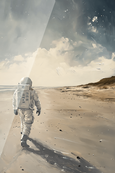 En tankeväckande och drömlik bild av en ensam astronaut som vandrar längs en öde strand, där himmel och hav smälter samman i ett surrealistiskt landskap. Den mjuka ljussättningen och de detaljerade penseldragen ger en nästan målarduks-liknande känsla.