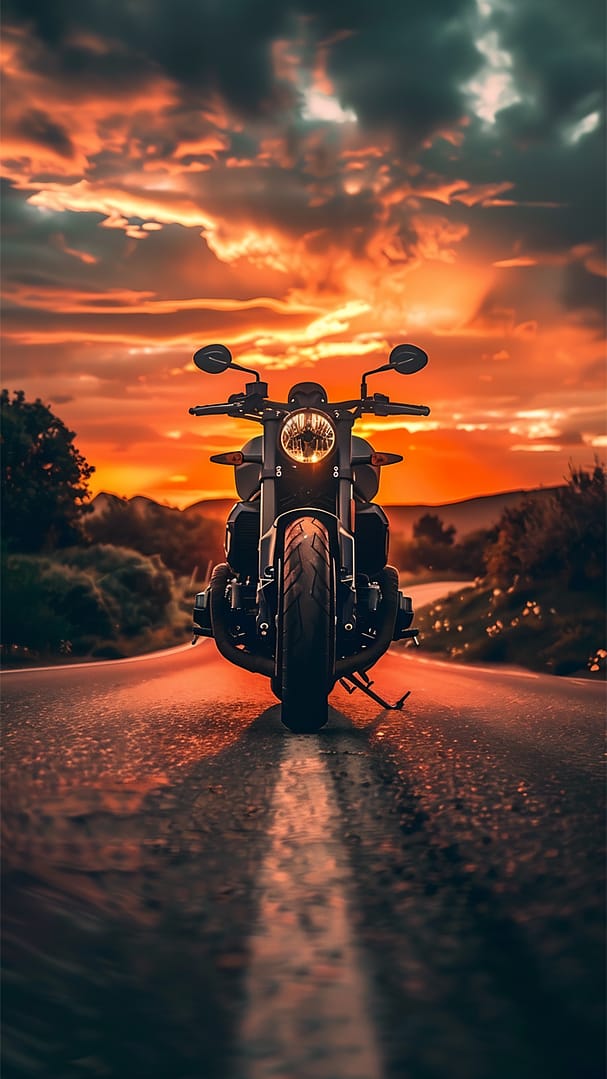 En ensam motorcykel står stadigt i solnedgångens eldiga sken. Den lysande neonringen runt däcket och strålkastaren bryter tystnaden som ett löfte om fart. Det här är inte bara en maskin – det är en rebellisk själ, fångad i ljus och asfalt.