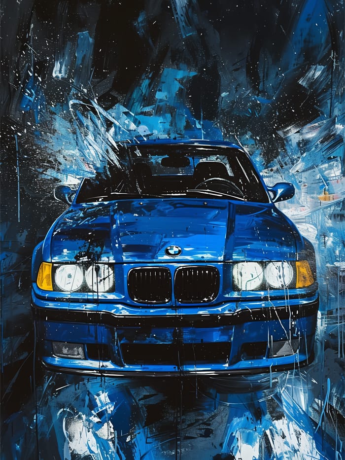 Den djupblå lacken kontrasterar mot en kaotisk bakgrund av stänk, penseldrag och digital hetta i blått, vitt och svart. Varje färgklick känns som ett eko av fart, varje reflektion ett spår av kraft. Hela scenen andas aggressiv energi.