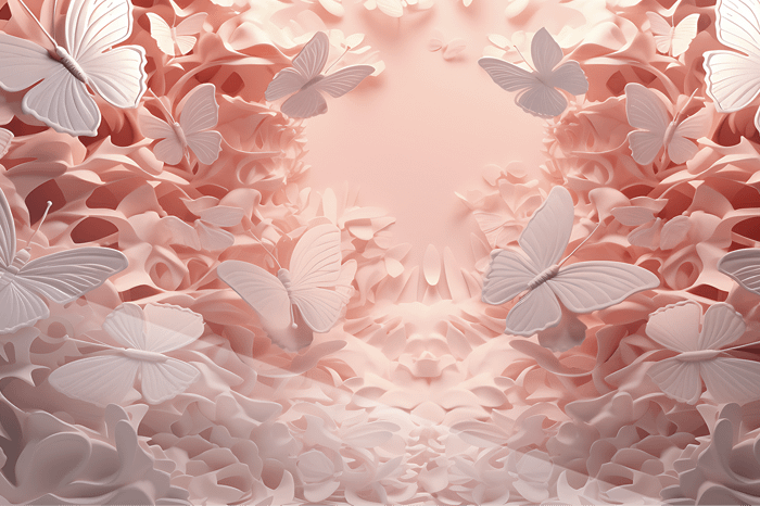 En eterisk scen där fjärilar svävar genom ett mjukt, rosa skymningslandskap. De varma orangea neonkonturerna lyser upp två fjärilar i centrum, som dansar i luften bland blomblad och skuggor – en visuell poesi i ljus och form.
