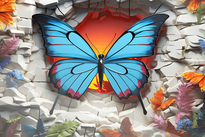 En explosiv fusion av natur och dynamik! Den lysande blå fjärilen slår sig fri genom en sprucken vägg, där livfulla färger och ljuseffekter skapar en dramatisk kontrast. Dess neonkant förstärker intrycket av rörelse och kraft, medan de omgivande fjärilarna tillför en känsla av liv och frihet.