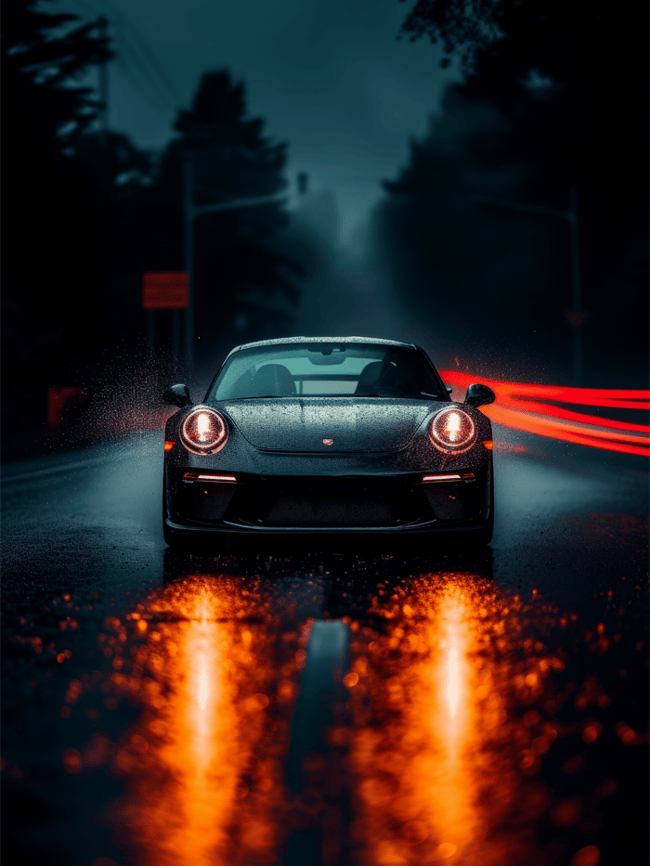 Framifrån stirrar den som en besatt. En Porsche GT3 RS, upplyst av iskalla ögon och omringad av ett brinnande ljus – inte en bil, utan en vilande kraft. Vägen framför är tom, men laddad. Något ska bryta sig loss.