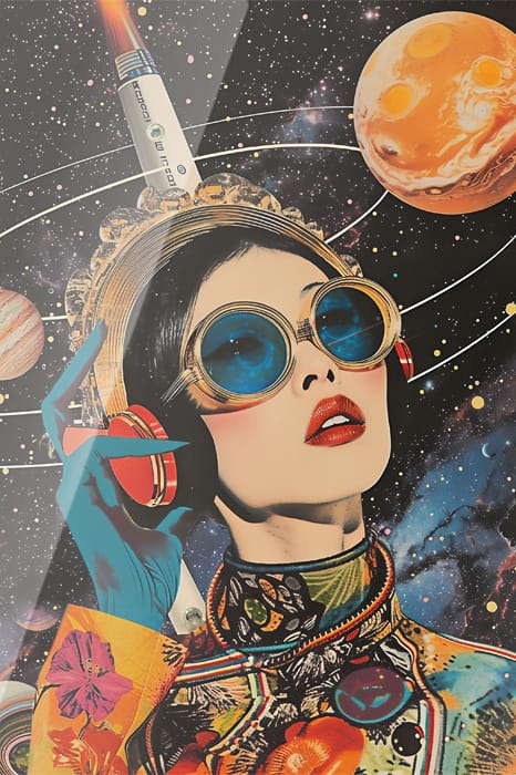 En futuristisk och färgstark illustration som kombinerar retrofuturism med modern popkonst. Mot en bakgrund av planeter och en uppskjutande raket, bär en elegant kvinna neonupplysta glasögon och hörlurar, vilket ger en känsla av intergalaktisk stil och teknologi.