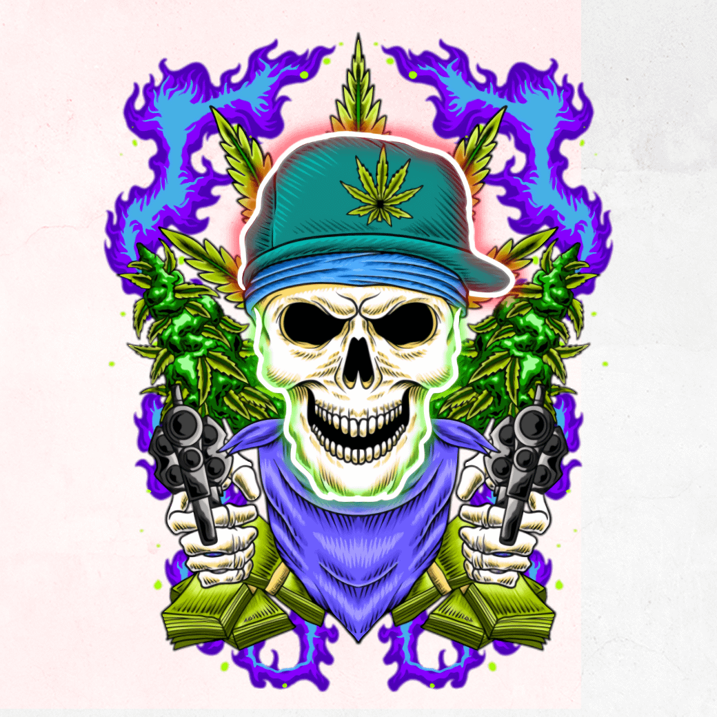 Ett hårdkokt och iögonfallande konstverk som visar en vit dödskalle med ett kaxigt uttryck. Dödskallen bär en turkos keps med ett broderat cannabisblad och en lila bandana runt halsen. I händerna håller dödskallen två svarta pistoler, och under händerna syns buntar med gröna sedlar. Runt dödskallen finns frodiga gröna cannabisplantor och en dynamisk aura av lila och turkos neonliknande rök eller lågor. Konstverket har en slät och glansig epoxibeläggning som förstärker färgerna och ger en skyddande yta.