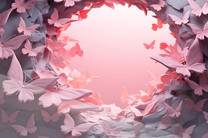 En förtrollande öppning formad som ett hjärta, omgiven av rosa fjärilar som verkar vakta en hemlig passage till en annan värld. En varm neonglöd ramar in hålet och skapar en känsla av magi och förväntan.