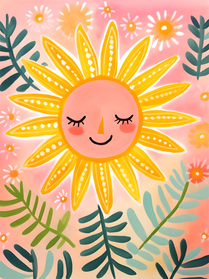 En strålande glad sol lyser i centrum av bilden, med ögon slutna i rofylld lycka och rosiga kinder som sprider värme. Solen omges av färgglada blommor och gröna blad i lekfulla former som dansar på en mjuk rosa bakgrund – en bild fylld av kärlek och sommarens magi.