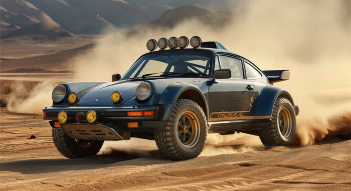 En Porsche muterad för grus, damm och revolt. Ljusringar brinner kring dess däck