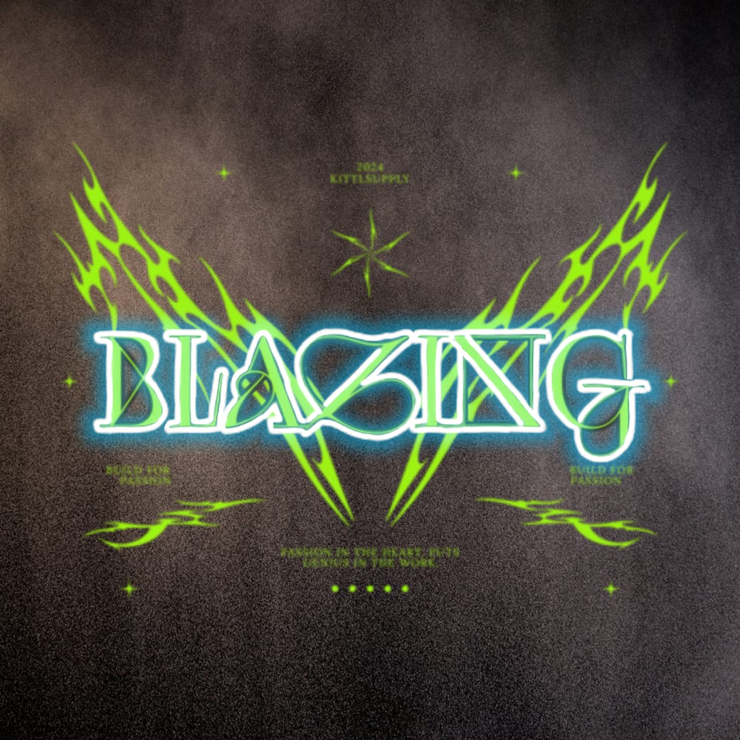 Ordet “BLAZING” har en tydlig vit neonkontur som får det att lysa starkt mot den mörkare gröna fyllningen. De stiliserade grafiska elementen i mörkare grönt har en nästan självlysande kvalitet som bidrar till den energiska effekten.