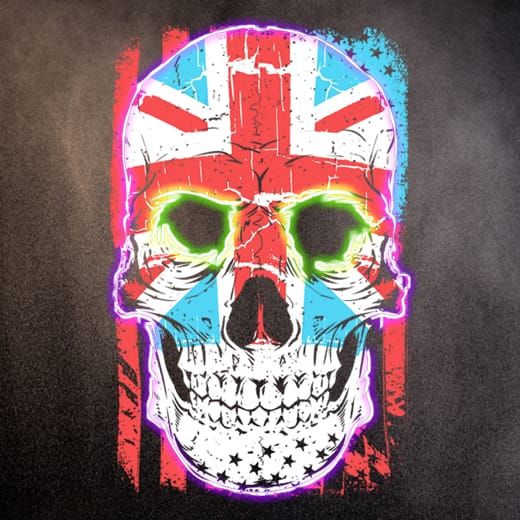 En sammanstötning mellan nationer, kulturer och punkattityd – denna dödskalle bär både den brittiska Union Jack och amerikanska stjärnor som en symbol för gränsöverskridande uppror. En visuell krock med historisk tyngd och neonblossande attityd.