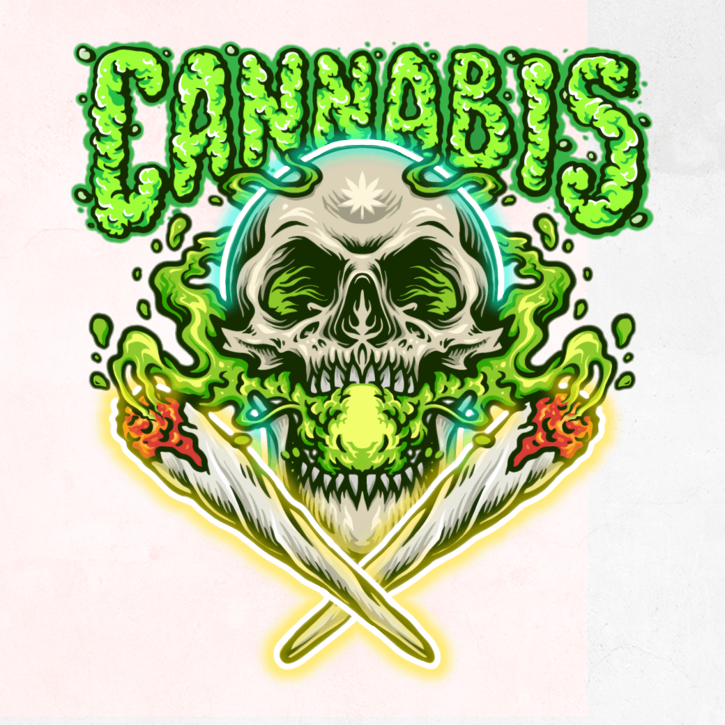 Ordet “CANNABIS” har en tydlig ljusblå neonkontur som får det att sticka ut. Jointsen under dödskallen har en intensiv gul neonkontur som fokuserar på den brinnande änden och skapar en het kontrast till den gröna röken.