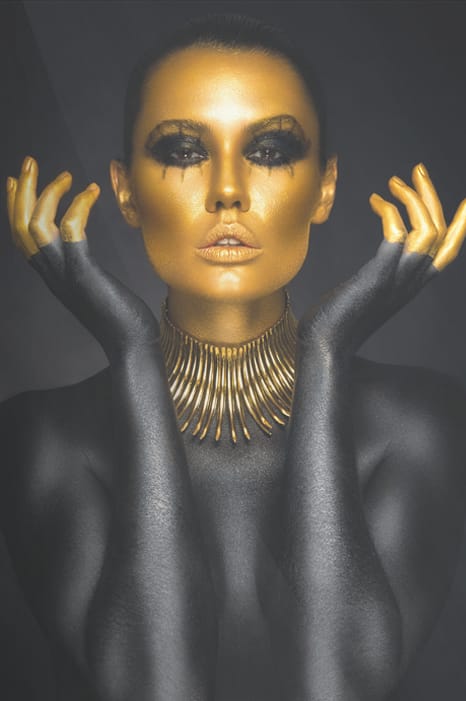 Utstråla självförtroende och styrka med detta fantastiska neonporträtt, med lyxiga gyllene toner mot en djup svart bakgrund. Den slående metalliska sminkningen och de skimrande gulddetaljerna skapar en fängslande kontrast, medan de lysande neoninslagen ger en modern touch. Perfekt för att tillföra en känsla av kraft och glamour till alla samtida interiörer