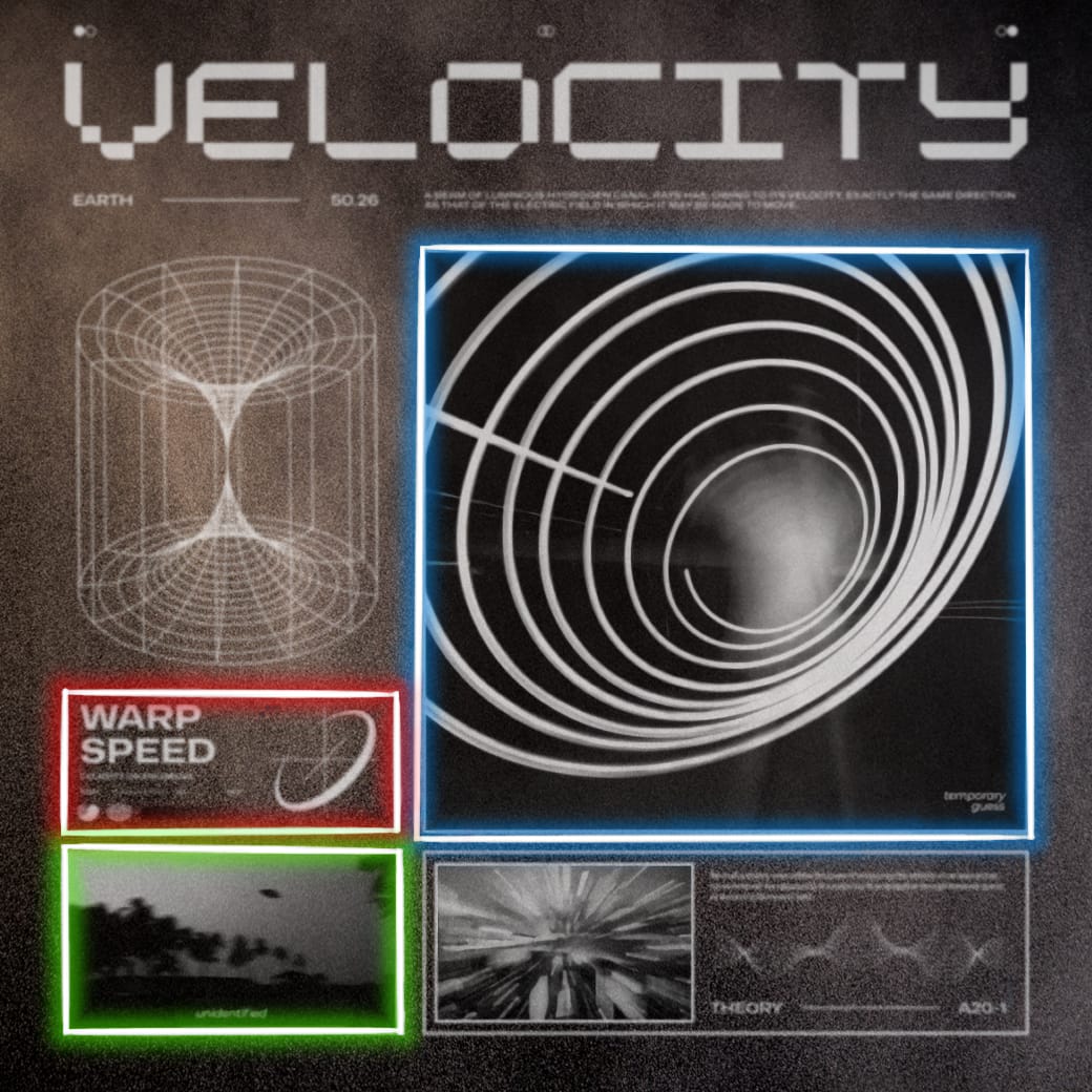 Ett intrikat och visuellt stimulerande konstverk som utforskar konceptet hastighet genom olika vetenskapliga diagram och textfragment. Överst står ordet “VELOCITY” i stora, stiliserade bokstäver. Bilden innehåller representationer av rumtidskrökning, potentiellt en maskhålsliknande struktur med en vit neonkontur, och ett spiralformat objekt med en ljusblå neonkontur. Det finns även text som refererar till “WARP SPEED” inramat i en röd neonkontur och en suddig bild av ett oidentifierat objekt inramat i en grön neonkontur. Längst ner till höger finns texten “THEORY” och “A2G-1”. Hela kompositionen har en känsla av avancerad vetenskap och utforskning av rymden. Konstverket har en slät och glansig epoxibeläggning som förstärker kontrasterna och ger en skyddande yta.