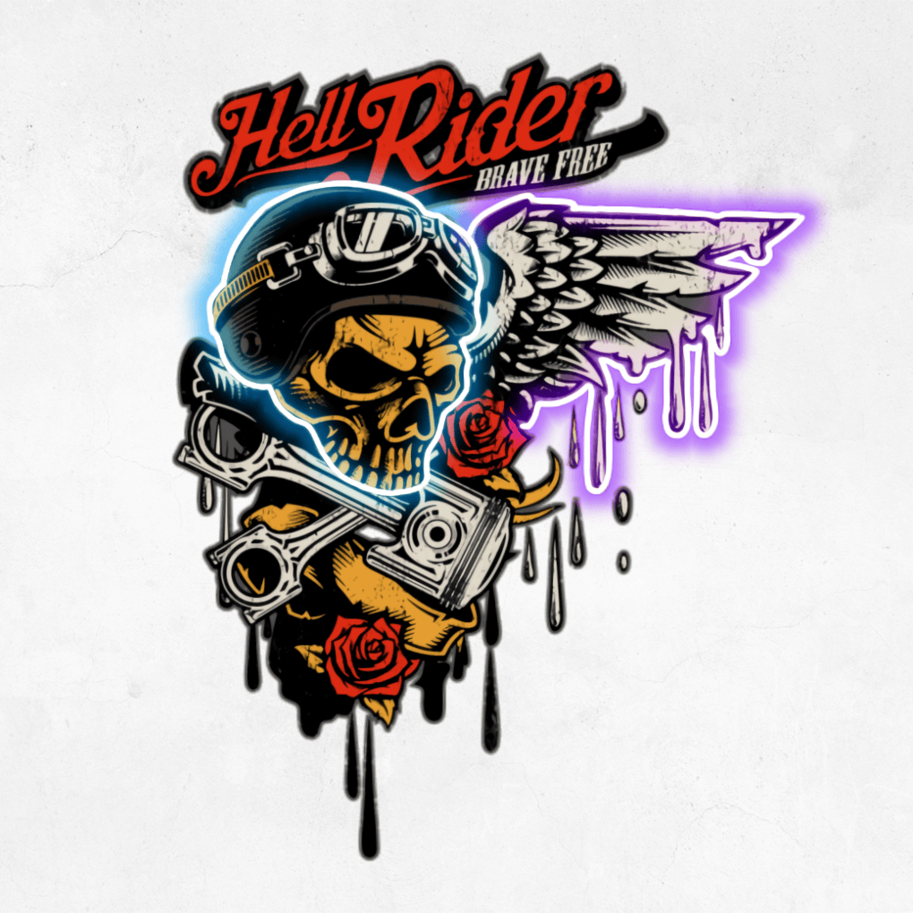 “Brave Free” – inte en slogan, utan en förbannelse mot vardagen. En påminnelse om att livet inte ska överlevas, utan brännas upp i ett hjulspinn. Hell Rider är mer än en symbol – det är en livsform på två hjul.