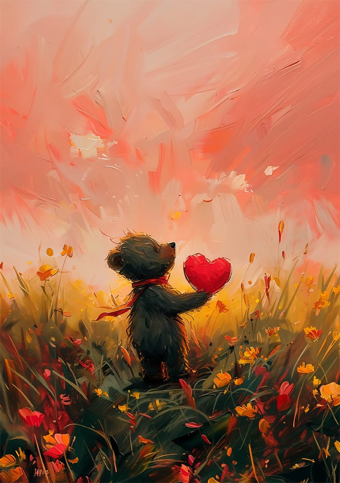 Den rosa- och aprikosfärgade himlen möter det gyllene blomsterfältet i en symfoni av mjuka röda, gula och gröna nyanser. Den lilla björnens mörka päls skapar en fin kontrast till det ljusa hjärtat och den varma omgivningen.