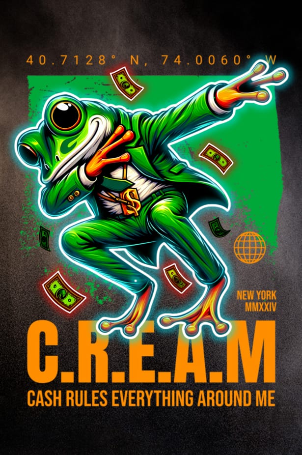 En neonfylld knytnäve i ansiktet på kapitalismens cirkus. Grodan i kostym är inte bara en meme – han är rörelsen. En modern trickster, lika delar Wall Street-veteran och street-smart rebell. Varje dabb är ett hånflin mot ekonomiskt förtryck – en segervals för den som fattat spelets regler.