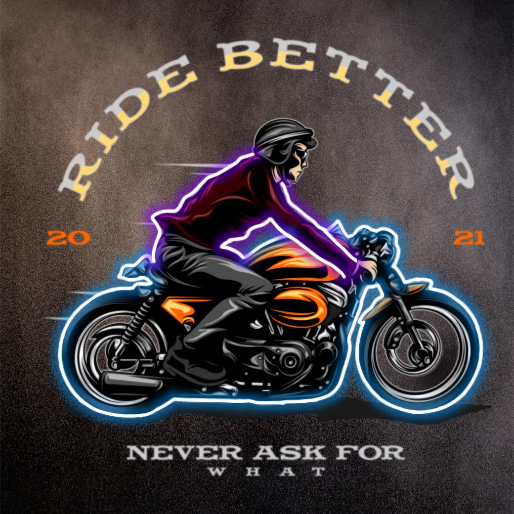 En hyllning till frihet, fart och att välja vägen själv. Den här dynamiska designen visar en motorcyklist i rörelse, omgiven av neonblå och lila konturer som framhäver varje detalj. Texten “Ride Better – Never Ask for Weather” säger allt: det handlar inte om vädret, det handlar om att alltid köra vidare.