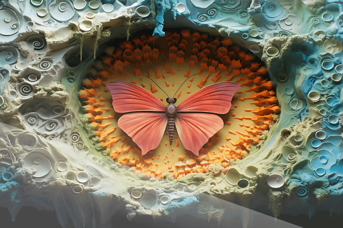 neonfjäril, väggkonst, korallröd fjäril, fantasifull inredning, LED-konst, epoxykonst, abstrakt bakgrund, röd neon, modern väggdekor, färgstark konst, unik heminredning
