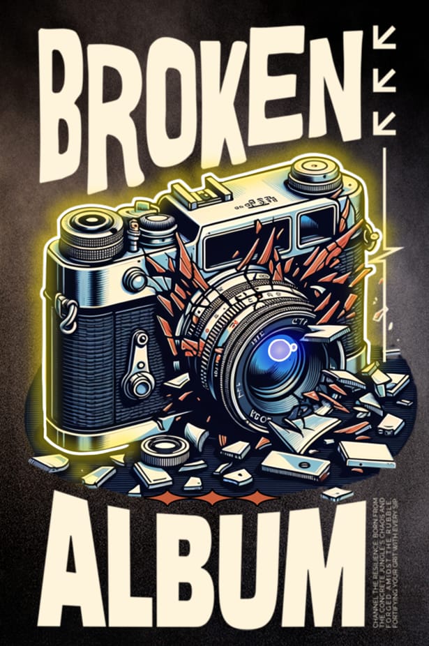 Ett häftigt och iögonfallande konstverk som visar en klassisk kamera som exploderar i en mängd fragment. Kameran är detaljerad i grått och svart med inslag av orange och blått i linsen. Runt kameran och de flygande bitarna finns starka neonkonturer i gult och blått, vilket ger en känsla av energi och kaos i ögonblicket av förstörelse. Ovanför kameran står ordet “BROKEN” i stora, vita bokstäver med en mörk kontur. Under kameran står ordet “ALBUM” i liknande stil. Längst ner finns en text som beskriver ögonblickets intensitet. Konstverket har en slät och glansig epoxibeläggning som förstärker färgerna och ger en skyddande yta.