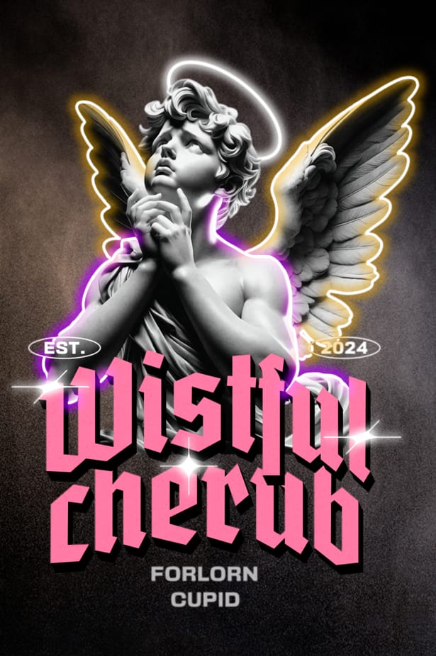 Ett vackert och stämningsfullt konstverk som visar en ljus ängel med händerna knäppta framför bröstet, blickandes uppåt med ett uttryck av längtan eller hopp. Ängeln har stora, detaljerade vingar och en lysande vit neonhalo runt huvudet. Runt ängeln finns en mjuk aura av rosa och lila neonliknande ljus. Ovanför ängeln står “EST.” och “2024” på varsin sida. Under ängeln står texten “Wistful cherub” i stora, rosa bokstäver med en vit kontur, och under det “FORLORN CUPID” i mindre, vita bokstäver. Konstverket har en slät och glansig epoxibeläggning som förstärker ljuset och färgerna och ger en skyddande yta.